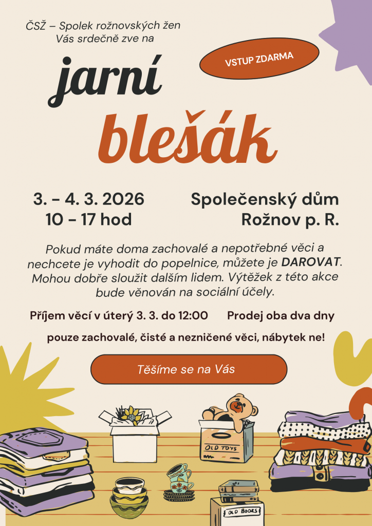 Spolek rožnovských žen Vás srdečně zve na jarní blešák, který se bude konat ve dnech 3. – 4. března v sále Společenského domu. Věci zde mohou dostat druhou šanci a udělat...