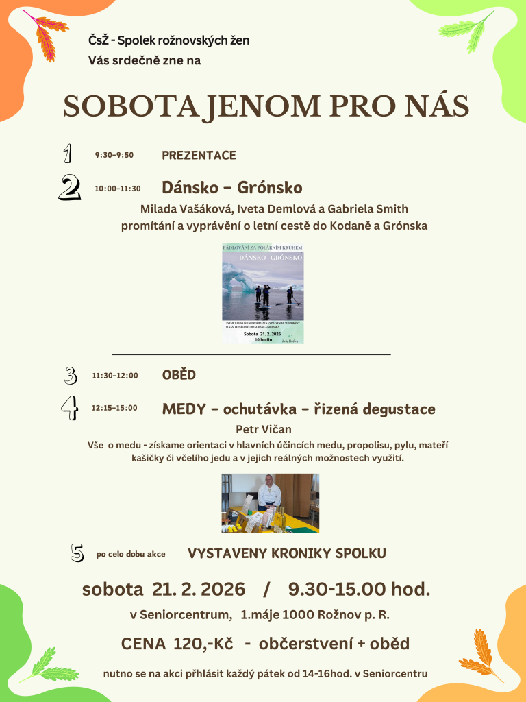 je naše tradiční akce, která se koná v sobotu 21. 2. 2026 v sále Seniorcentra. Sejdeme se cca v 9.30 hod., abychom stihly kávu a něco dobrého z našich domácích kuchyněk(co si doneseme,...