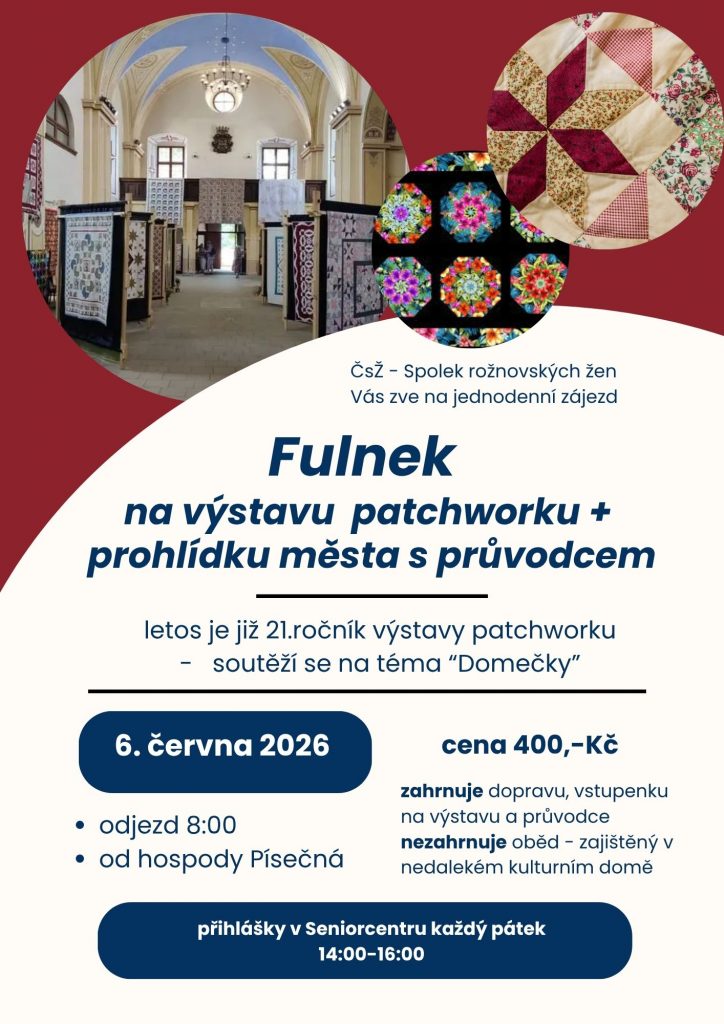 Přidejte se k nám na příjemný jednodenní výlet do Fulneku v sobotu 6. června 2026! Čeká nás návštěva tradiční patchworkové výstavy, kterou každoročně připravuje První moravský...